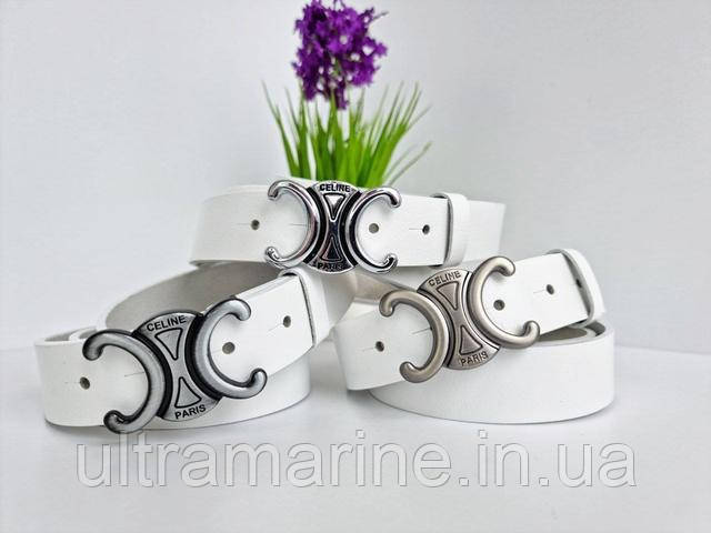 Стильний шкіряний жіночий ремінь Celine 3 см Селін білий з металевою срібною пряжкою